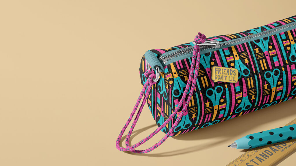 Die Kollektion umfasst eine Vielzahl an Mustern, die Schreibwaren und Büromaterialien in den Mittelpunkt stellen. Scheren, Stifte, Zirkel und weitere Utensilien werden grafisch reduziert und so angeordnet, dass strukturierte, geometrische Muster entstehen. Diese klaren Kompositionen werden bewusst durch aufgelockerte Designs ergänzt: expressive Tintenkleckse und ein fröhlich-buntes Hero-Design sorgen für Bewegung und visuelle Abwechslung.